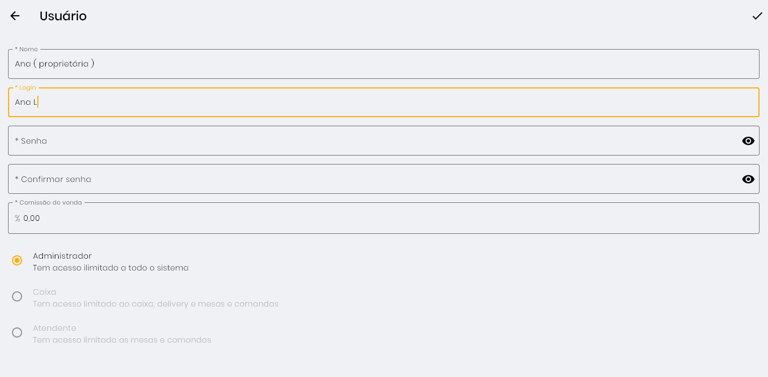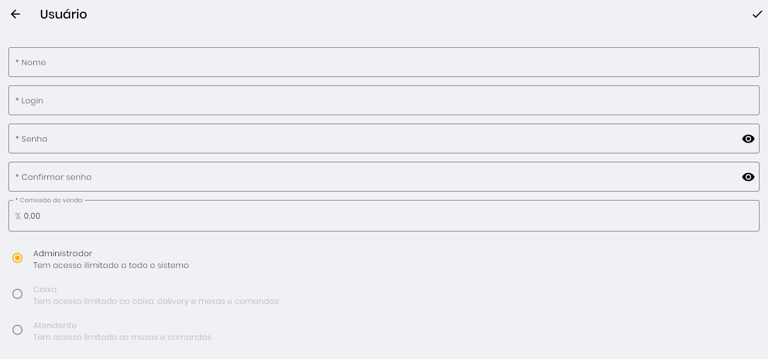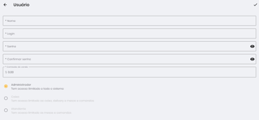 Com acesso somente aos módulos “Clientes” e “Mesas/comandas”.