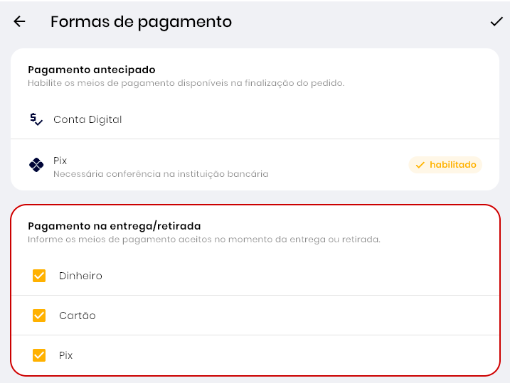 Na seção Pagamento na entrega/retirada, habilite as formas de pagamento desejadas.