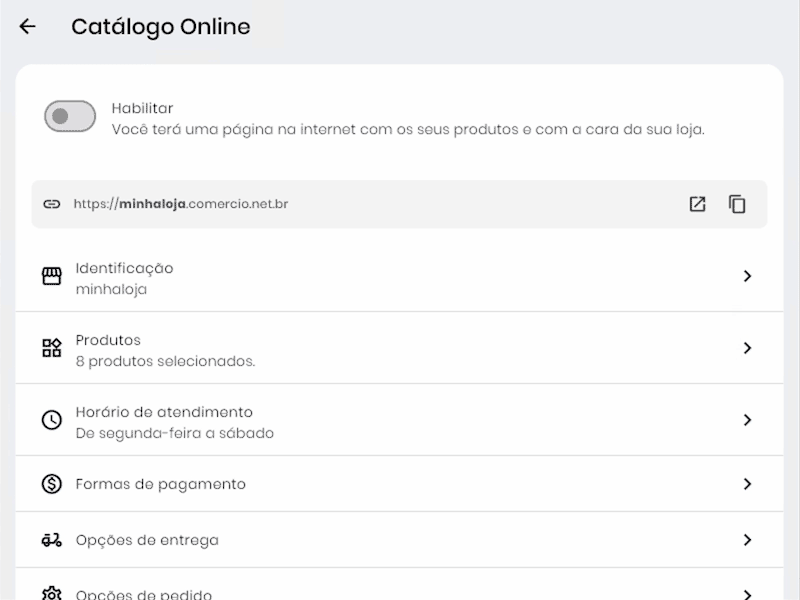 Quando finalizar a configuração de seu Catálogo Online, clique em Habilitar.